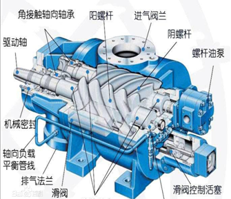 汽缸内装有一对互相啮合的螺旋形阴阳转子,两转子都有几个凹形齿,两者互相反向旋转