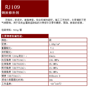 RJ-109钢质修复剂是以金属及合金为骨材的聚合金属复合型修补材料,用于修补和密封铸铁、铸钢、铜、铝等合金的铸件的气孔、砂眼、裂纹等缺陷。