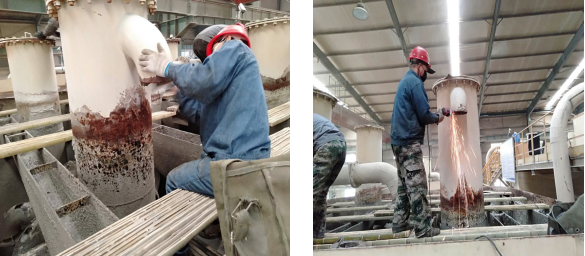在选矿行业中充气式浮选柱使用范围广,腐蚀、磨损问题最严重。对于充气式浮选柱耐磨修复问题,洛阳融基工贸根据不同生产环境、不同磨损问题均有相对应的解决方案和修复产品,修复步骤近乎相同,具体参照(融基产品中心)