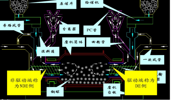 双进双出磨煤机工作原理:原料通过能自动控制速度的给料机进入落煤管,靠重力作用落入输送装置下方进入磨煤机筒体,原煤磨成粉后通过一级风进行干燥并将煤粉输送到磨煤机上方分离器中,不合格的粗煤粉重新落入磨煤机二次粉碎,合格的细煤粉进入燃烧器充分燃烧提供热能